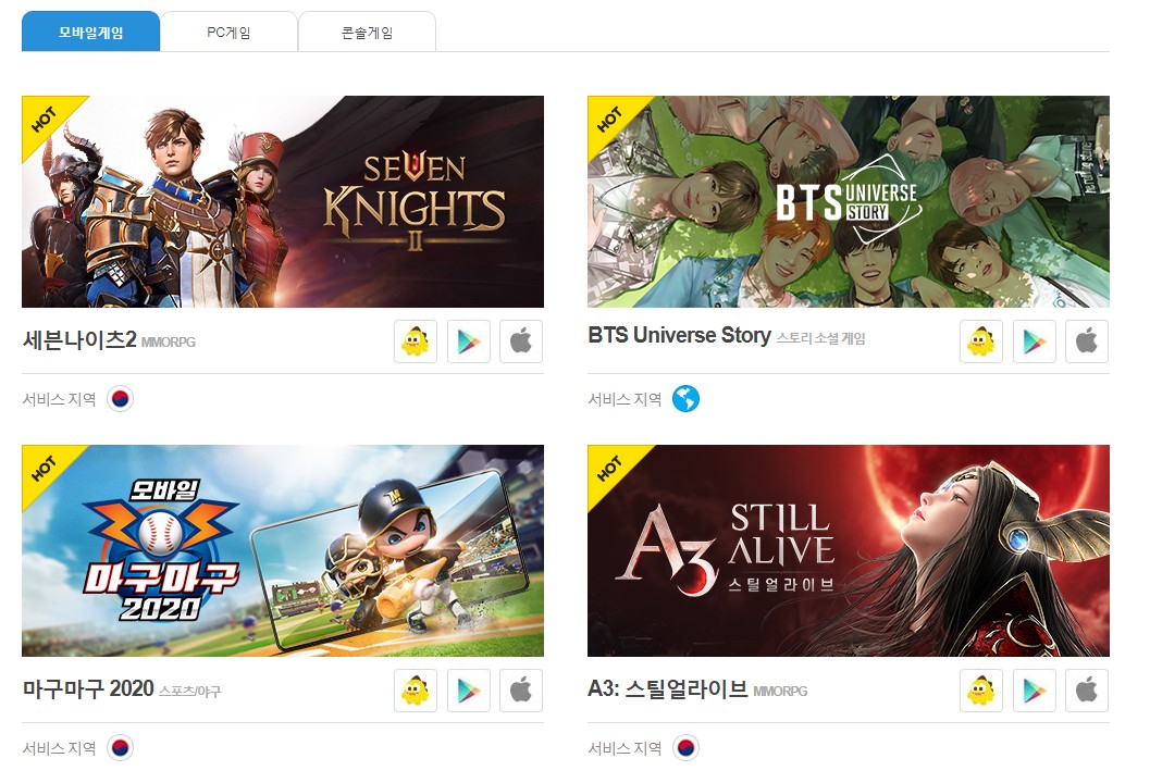 '몬스터길들이기' 등이 있다. MMORPG부터 캐쥬얼 장르까지 다양한 라인업을 갖추었으며, 구글플레이, 애플 앱스토어 등 마켓에서 높은 순위를 보이는 게임을 다수 보유하여 투자자들의 주목을 받고 있다.