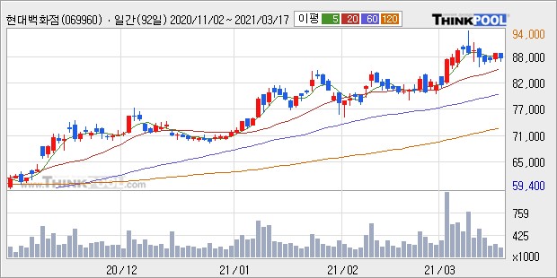 실제로 안지영 IBK투자증권 연구원은 "프리 오픈 매출액은 약 20억원을 웃돌며 기대치 120%, 그랜드 오픈 매출액은 약 50억원으로 추정돼 기대치를 크게 상회한 거승로 보인다."며 "더현대서울의 올해 총매출액은 6500억원으로 전망한다. 여의도는 서울 3대 상권으로 1일 유동인구 30만명, 3km 내에 144만명 거주 5km내에 5개 뉴타운 개발로 기존 3만 세대에서 5만 9000세대로의 확장성을 고려한다면 판교점 이상의 모멘텀을 가지고 있다."라고 분석했다. 전문가들이 잇따라 긍정적인 의견을 제시하면서 주가도 최근 상승세를 보였는데, 레이더스탁 '로보추천'이 새로운 매수신호를 보냈다.