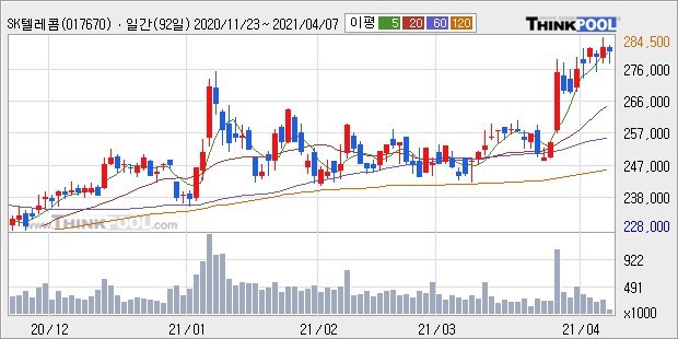 바로 SK텔레콤(017670)이다. SK텔레콤은 이동전화, 무선데이터, 정보통신사업 등의 무선통신사업, 전화, 초고속인터넷, 데이터 및 통신망 임대서비스 등을 포함한 유선통신사업, 플랫폼 서비스, 인터넷포털 서비스 등의 사업을 하고 있는 기업이다. 1996년 CDMA 세계 최초 상용화를 시작으로 2013년 세계 최초 LTE-A 상용화, 2019년 세계 최초 5G 상용화 등 대한민국 이동통신 산업 발전의 중심에 서 있으며, 넓은 커버리지와 빠른 속도, 철통 보안으로 5G 시대를 선도하는 것은 물론 글로벌 5G 생태계 구축에도 앞장서고 있어 투자자들의 주목을 받고 있다.