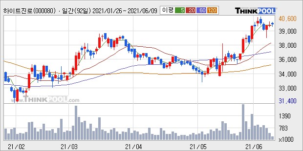 실제로 조미진 NH투자증권 연구원은 "하이트진로는 국내 맥주와 소주부문에서 사회적 거리두기 영향을 받았으나 수입맥주와 해외판매 확대가 국내 실적 감소를 방어하며 시장 전망치를 웃도는 실적을 냈다."며 "그동안 아쉬웠던 해외매출 비중이 확대되며 하이트진로의 중장기 성장동력으로 자리잡을 것이며 하이트진로 국내 실적도 백신 보급률 확대 및 사회적 거리두기 완화 시점에 음주 소비가 급격하게 증가하면서 가파르게 회복될 것이다."고 분석했다. 전문가들이 잇따라 긍정적인 의견을 제시하면서 주가도 최근 상승세를 보였는데, 레이더스탁 '로보추천'이 새로운 매수신호를 보냈다.