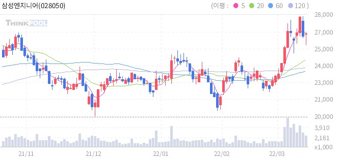 바로 삼성엔지니어링(028050)이다. 삼성엔지니어링은 전 세계 플랜트 시장에서 활발한 사업을 전개하는 글로벌 EPC(설계, 구매, 시공) 전문 기업이다. 최근 윤석열 대선 후보의 대통령 당선 이후 민간 주도의 대규모 주택 공급과 사회간접자본(SOC) 투자 확층 공약이 호재로 작용하고 있다. 또한 국제유가 급등에 따른 해외플랜트 수주 확대 기대감에 투자자들의 주목을 받고 있다.