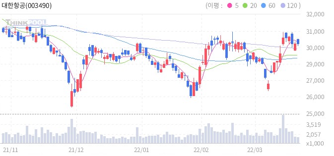 바로 대한항공(003490)이다. 대한항공은 국내 1위의 항공운송기업으로 국내 13개 도시와 해외 42개국 107개 도시에 취항하여 항공운송사업을 수행하고 있다. 코로나19 장기화와 최근 러시아 침공 사태로 유가가 급등하며 연료비가 확대되는 등 위기도 있었다. 하지만 화물 부문의 운임(Yield)이 지난 4분기 사상 최고치를 경신하며 전년 동기 대비 37.1% 증가할 것으로 예상된다. 또한 국내 항공산업 재편을 위해 아시아나 항공 인수를 추진하면서 투자자들의 주목을 받고 있다.