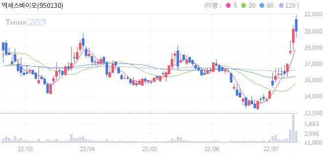 바로 엑세스바이오(950130)이다. 엑세스바이오는 체외 진단 기술을 토대로 면역화학 진단, 바이오센서, 분자진단 기술을 기반으로 진단 제품을 개발, 재조, 판매하는 업체이다. 최근 코로나19 확진자 수가 2배로 증가하는 '더블링'수준의 확산이 지속되며 13일 기준 63일 만에 확진자 수가 4만 명을 넘어섰다. 이와 더불어 전 세계 원숭이 두창 확진자가 2달 만에 9,000명을 돌파하며 자회사인 웰스바이오가 원숭이 두창 진단시약의 독자 연구 개발을 마쳤다고 밝혀 투자자들의 주목을 받고 있다.