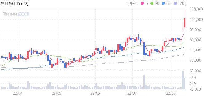 바로 덴티움(145720)이다. 덴티움은 국내 시장 점유율 2위의 의료용구 및 의료장비 제조 및 판매 업체이다. 덴티움은 2022년 1분기 매출이 국내 130억, 해외 560억으로 해외 영업 부문이 전체 매출의 상당 부분을 차지하고 있다. 리오프닝과 함께 제품 생산 및 수출에 탄력을 받고 있어 유럽과 아시아 향 수출이 크게 증가했다. 한림대학교성심병원이 국내 병원 중에서 최초로 치과 전담 로봇 수술실을 갖춘 센터를 만들어 운영한다고 밝혔는데 덴티움이 치과 로봇수술 시스템 공동 개발과 기술교류 등을 위한 업무협약을 체결해 투자자들의 주목을 받고 있다.