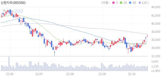 바로 신한지주(055550)이다. 신한지주는 신한금융 계열사에 대한 지배/경영관리, 종속회사에 대한 자금 지원을 하는 금융지주회사이다. 신한라이프 대표는 신한금융지주의 글로벌 경영 전략의 일환으로 해외 대체자산에 투자하기 위해 글로벌 사모펀드사인 콜버그크레비스로버츠(KKR)의 대표와 만났다. 다음 주 3분기 실적 발표를 앞둔 가운데 기준금리가 지속 상승하면서 이자 이익이 증가하고 있어 역대 최대 실적을 달성할 것으로 예상된다. 당기 순이익이 전년 대비 35.9% 증가하며 KB금융지주를 제치고 2분기 연속 금융 지주 실적 1위를 달성할 것으로 예상되며 투자자들의 주목을 받고 있다.